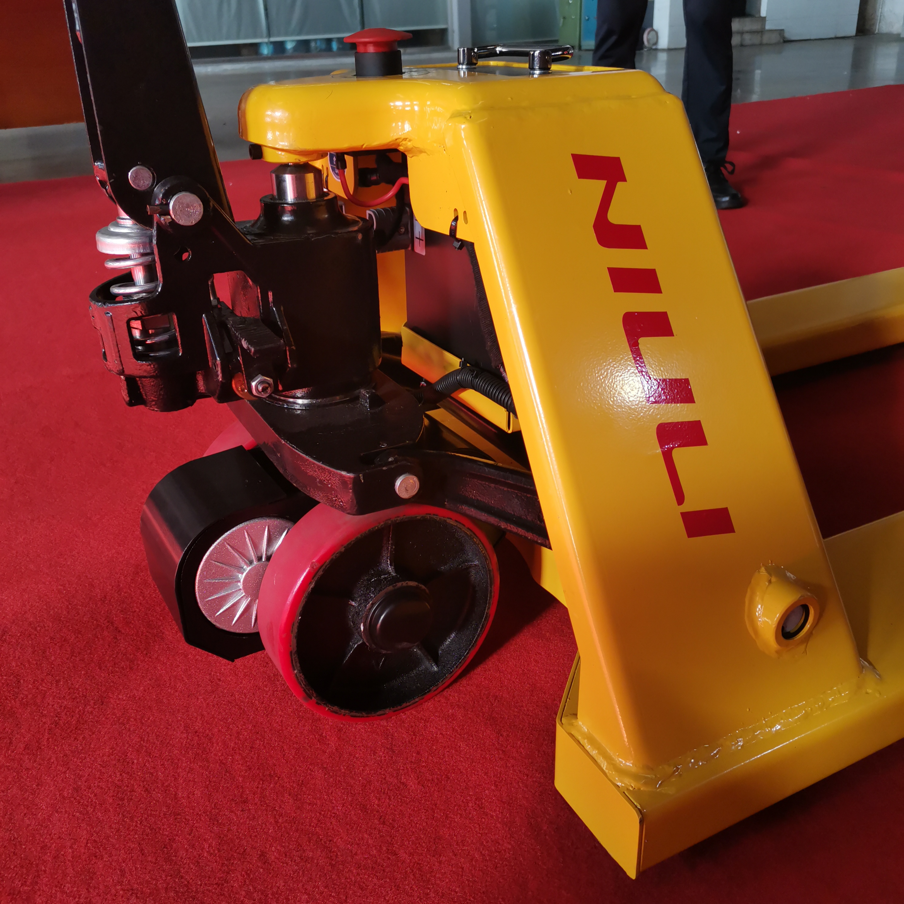 Griffsteuerung: Not-Rückwärtstaste; Die Batterieladeanzeige warnt den Benutzer; Vorwärts- und Rückwärtstaste zum Bewegen per Batterie; Heben und Senken per Hand.